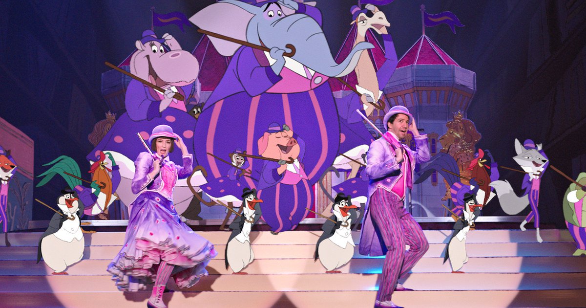 The mix of animation and live action, charming if clumsy in the first film, is again used here but benefits from the advances in film technology over the past half century. This means that the movie’s stand-out sequence, the journey into the chipped Royal Doulton bowl and Music Hall set piece are actually better than anything in Mary Poppins. The lyrics to ‘The Cover is Not a Book’ are as clever, cute and energetic and moving as anything the Sherman Brothers penned. Coupled with the gorgeous, Blackpool-rock coloured costumes, this brief segment of the film delights the eyes and ears from start to finish.